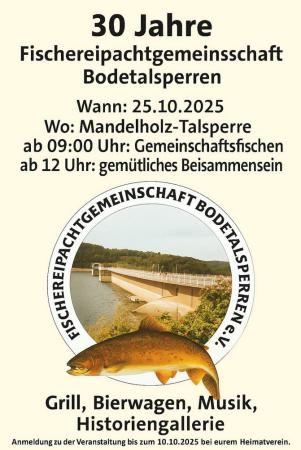 die Fischereipachtgemeinschaft Bodetalsperren e.V. begeht in diesem Jahr ihr 30-jähriges Bestehen und lädt aus diesem Anlass am 25.10.2025 zu einem Gemeinschaftsangeln mit anschließendem gemütlichen Beisammensein ein.