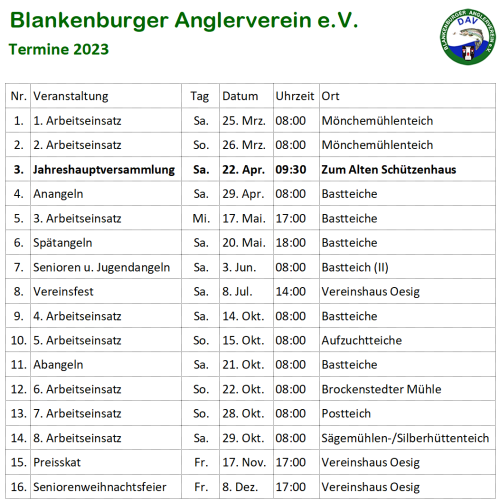 Übersicht der Termine für 202509.02.2025Hier sind die Termine für das Geschäftsjahr 2025, wie sie in der letzten Vorstandssitzung von den Anwesenden festgelegt und beschlossen wurden.